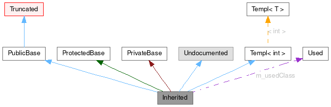 - A purple dashed arrow is used if a class is contained or used by another class. The arrow is labeled with the variable(s) through which the pointed class or struct is accessible.